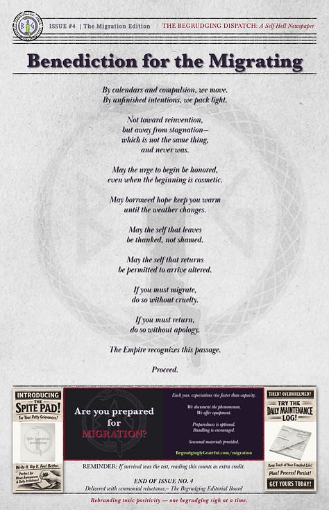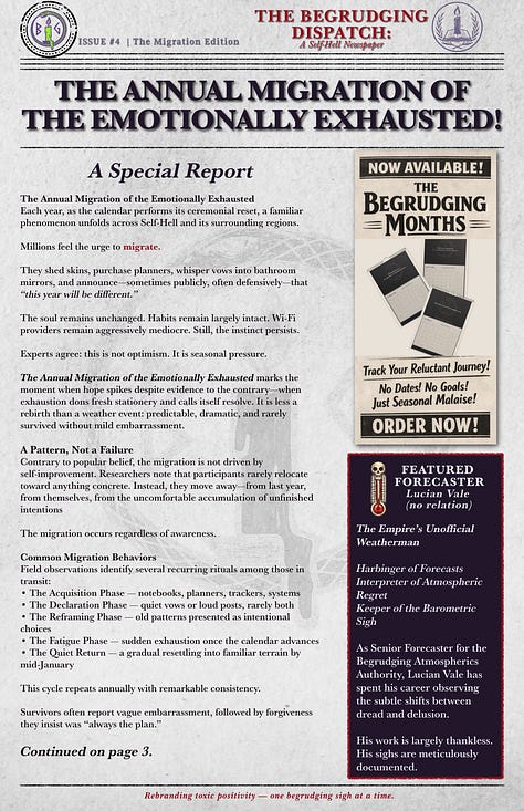 The Annual Migration of the Emotionally Exhausted marks the moment when hope spikes despite evidence to the contrary—when exhaustion dons fresh stationery and calls itself resolve. It is less a rebirth than a weather event: predictable, dramatic, and rarely survived without mild embarrassment.