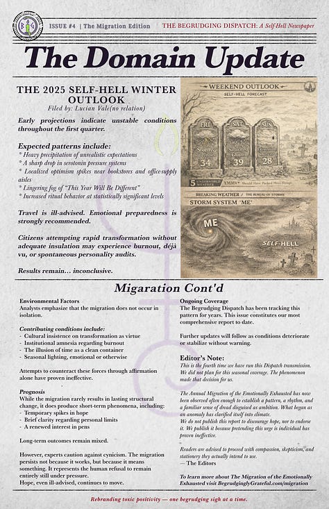 Each year, as the calendar performs its ceremonial reset, a familiar phenomenon unfolds across Self-Hell and its surrounding regions.