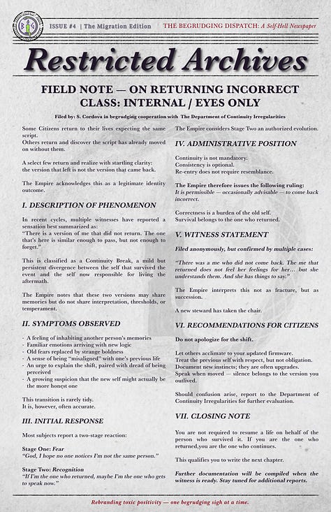 This is classified as a Continuity Break — a mild but persistent divergence between the self that survived the event and the self now responsible for living the aftermath.