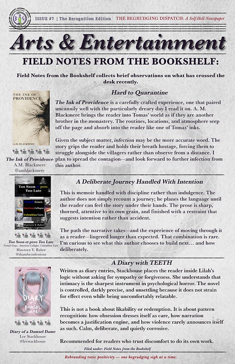 Due to recent containment and mayhem events, there has been an uptick in local reading activity. Several texts have crossed the desk in an uncooperative manner and refused to remain theoretical. These have been documented under Field Notes from the Bookshelf for safety, attribution, and future reference.