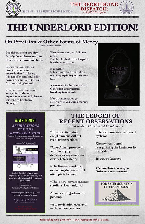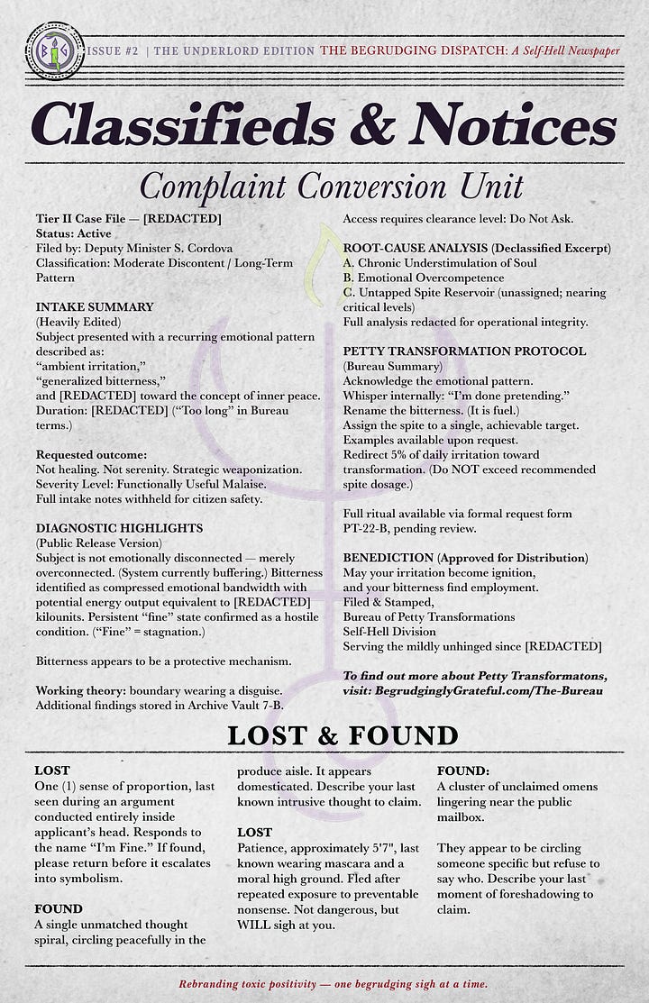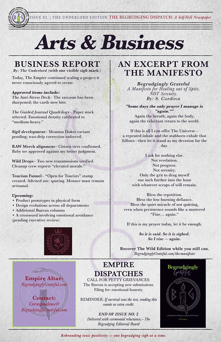 This is ridiculous in the best way — like someone bound all the intrusive thoughts of a burnt-out administrator into a sacred text and then formatted it as internal memos. The whole “empire of spite, ritual, and unwise ambition” thing makes the world feel weirdly functional; it’s satire, but it also reads like a real emotional infrastructure for people who are tired of being told to heal politely.